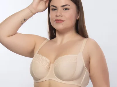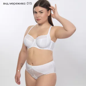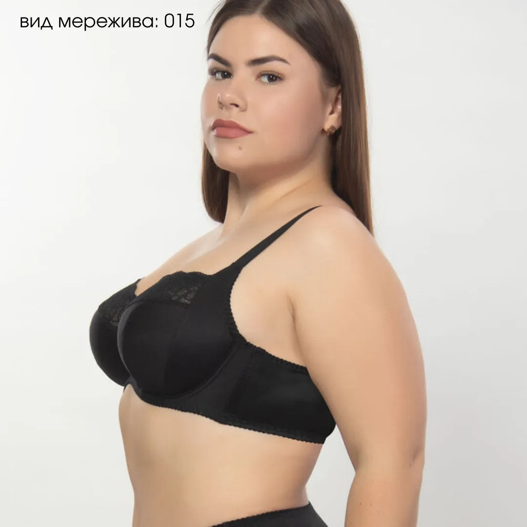 Бюстгальтер з м’якими чашками на каркасах з бічної коригучою деталлю і пружними пластинами в бічних деталях стану з трикотажного, еластичного полотна і мережива.