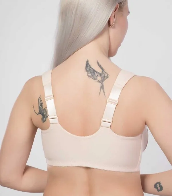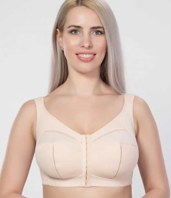 Бюстгальтер з м’якими чашками без каркасів із застібкою спереду з пружними пластинами в бічних деталях стану. Виготовлений з еластичного трикотажного бавовняного полотна. Розширені комфортні бретелі дубльовані тонким поролоном і бавовняним полотном.