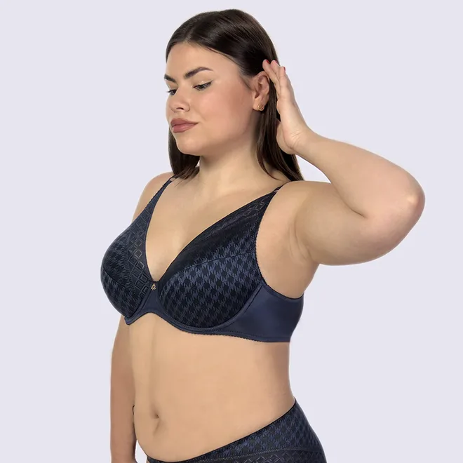 Графічне мереживо гарно охоплює груди.