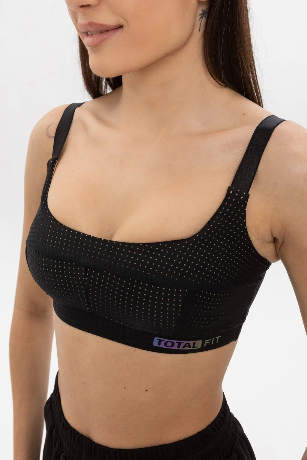 Чорний спортивний бралет (топ) без кісточок із перфорованої тканини, який підходить і на великі розміри чашок.
