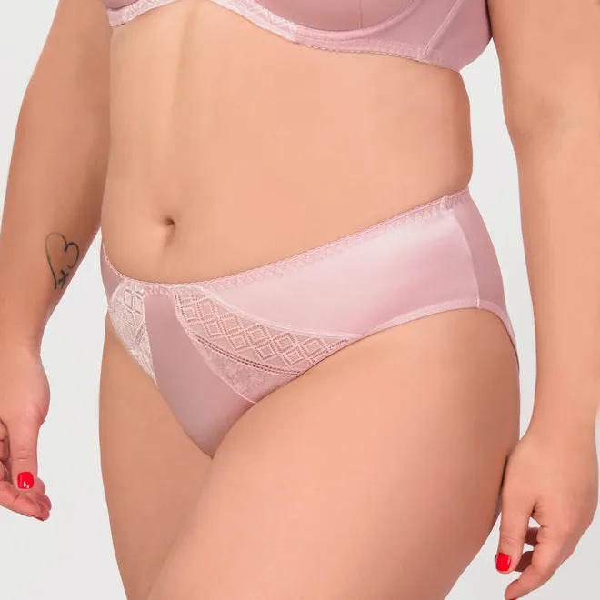 Трусики «сліп» з середньою лінією талії з м’якої еластичної тканини оздоблені німецьким мереживом з графічним візерунком.